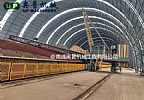 圆形料场顶堆侧取堆取料机是在目前日益提高的环保要求和节约占地要求基础上发展起来的一种新型室内仓储设备。这种产品在封闭厂房内布置,解决了物料在堆取过程中和料堆受风、雨水影响发生的流失、飞散等问题。通过设置周边挡墙解决了较小空间存储较多物料的问题。这种带有穹顶的用于大宗散状物料储存的封闭式料场型式,随着严格的环保要求日益受到社会的认可和关注,发展前景广阔。