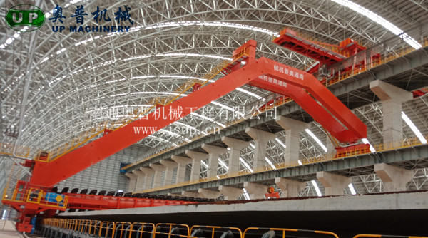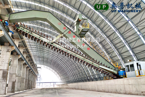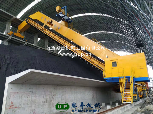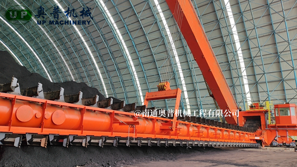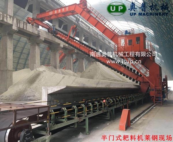 ▲南通奥普机械创新研制的“双刮板、双卷扬、翘尾式”半门式刮板取料机