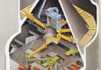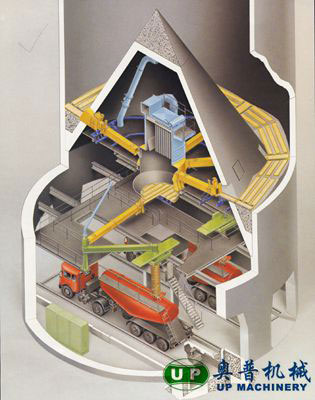 IBAU均化库采用德国汉堡公司的连续均化技术。在外部带一搅拌仓,IBAU均化库库底中心设一大圆锥,库内生料的重量通过锥传递给库壁,库底环形空间被分成向中心倾斜10°的6个充气区,每区装多种规格充气箱。充气卸料时生料被送至一条径向布置的充气箱上,再经过锥体下部的出料口由空气斜槽送入库底中央搅拌仓中。卸料时,生料在自上而下的流动过程中,切割水平料层而产生重力混合作用,进入搅拌仓后又因连续充气搅拌而得到进一步均化。均化值可达6-8,电耗0.1-0.2kwh/t生料。
