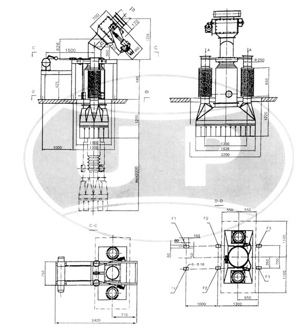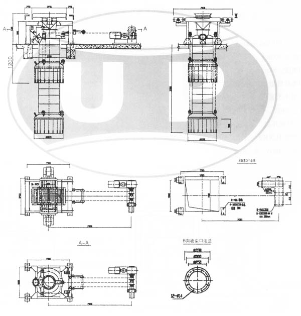 | 设备基础及埋件载荷 1.提升装置:FV=5KN×1.5 FH=20KN×2 2.进料口法兰:FV=50KN 3.散装头基础:FV=4×10KN×15注四个柱脚止均为:10KN×1.5(系数) FV垂直载荷 FH为水平载荷 | 主要技术参数 1.Zui大卸料能力:200-300T/H 2.物料Zui大粒度:小于50mm 3.物料Zui高温度:小于150° 4.含尘气体排放量:4500m3/h 5.提升电机功率:2.2-3KW 6.设备自重:3000kg |